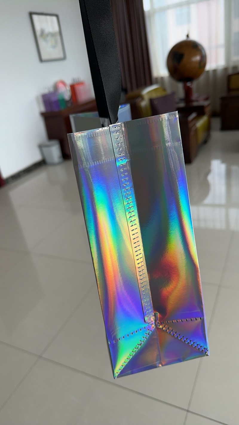 RGS PACKAGING z dumą przedstawia naszą najnowszą innowację -Torba na prezenty z laminowanej folii laserowej. Ten nowy produkt stanowi duży postęp w technologii pakowania, wytwarzany przy użyciu całkowicie nowego procesu, który eliminuje potrzebę stosowania tradycyjnych taśm i maszyn do szycia.